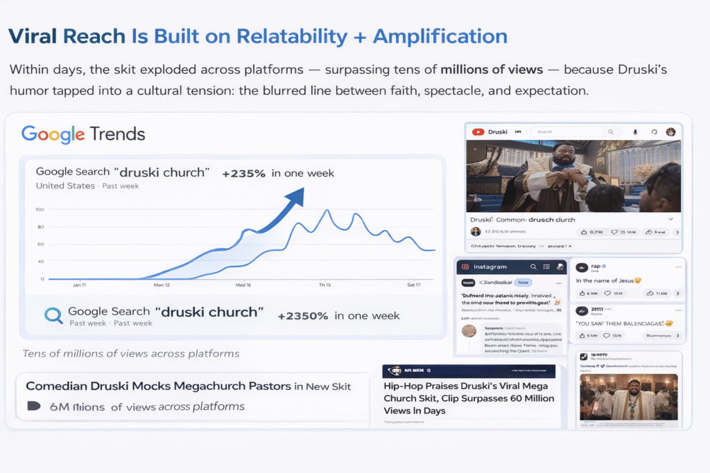This research-backed breakdown reveals how Druski’s comedic take on megachurch culture sparked a +2350% surge in Google search interest in under a week — proving that when content creators lean into relatable, real-life storytelling, they unlock viral reach and cultural relevance.